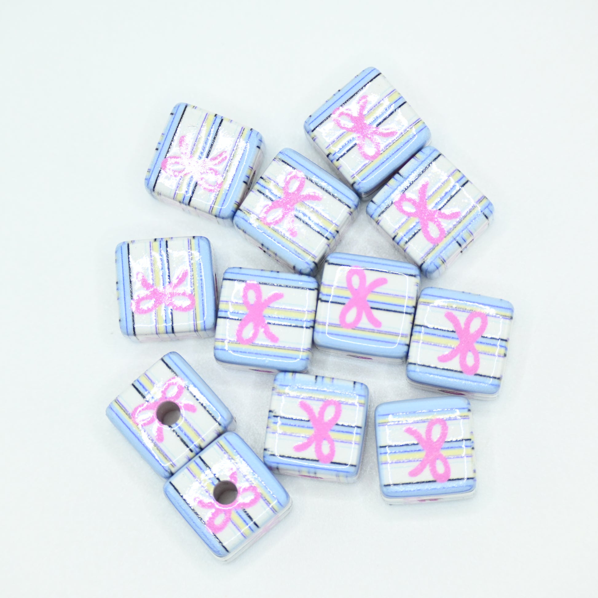 12pcs 20mm Acrylic Blue Cube Beads Pink Bow Ribbon Pattern DIY Beading Hairband Bracelets Necklace Craft
